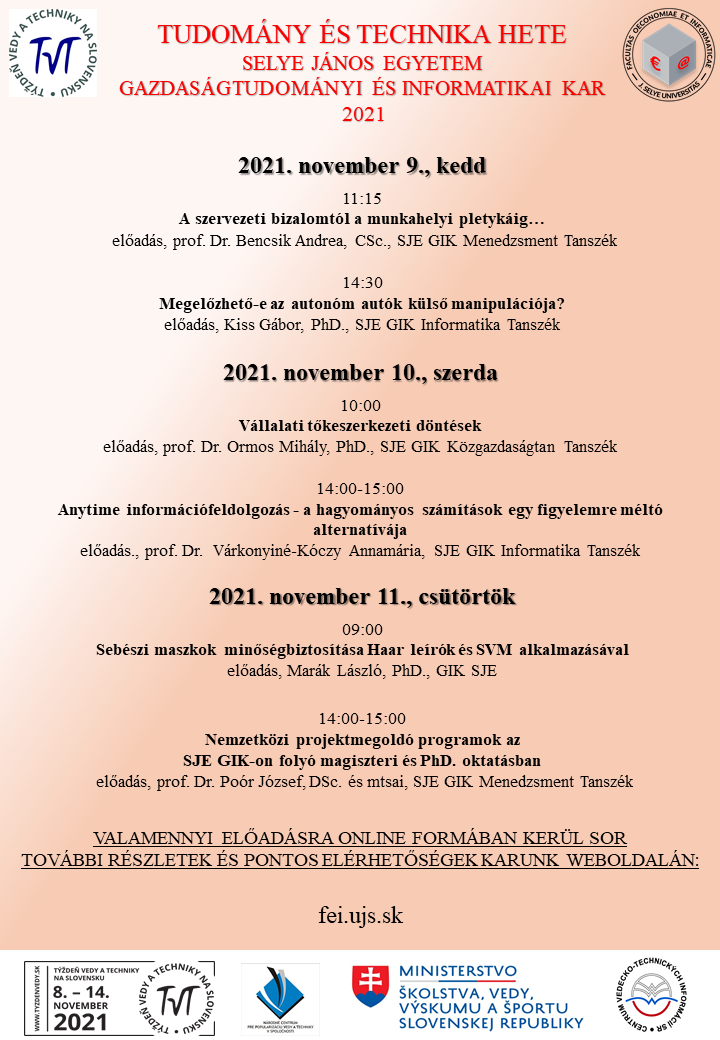 A Selye János Egyetem Gazdaságtudományi és Informatikai Kara kísérő rendezvények szervezésével hagyományosan, minden évben bekapcsolódik a Tudomány és Technika Hete rendezvénysorozatába. Idén az alábbi rendezvényekre várjuk az érdeklődőket, melyekre online formában kerül sor: