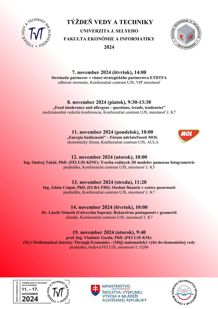 Fakulta ekonómie a informatiky Univerzity J. Selyeho sa každoročne zapája svojimi sprievodnými podujatiami do Týždňa vedy a techniky. Tohtoročné sprievodné podujatia na Fakulte ekonómie a informatiky Univerzity J. Selyeho
