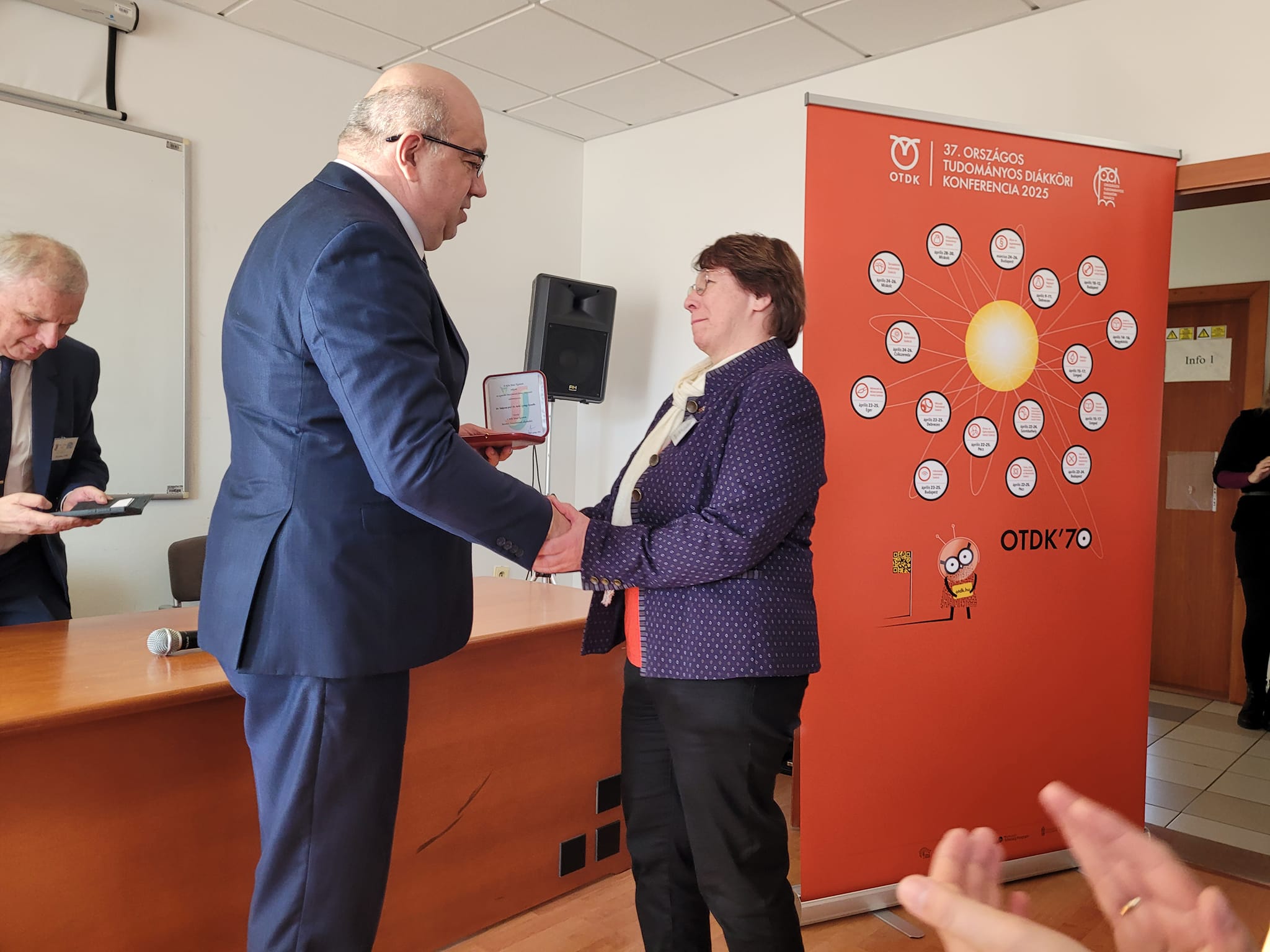 Bronzový stupeň pamätnej medaily Univerzity J. Selyeho si na návrh dekana našej fakulty mohla prevziať z rúk rektora Univerzity J. Selyeho, ktorá oslavuje 20. výročie svojho vzniku, dnes na slávnostnom otvorení XIX. ŠVOČ prof. Katalin Dr. Takácsné Dr. György, prezidentka Odborného výboru pre ekonomické vedy OTDT. Ďakujeme za poskytnutú pomoc pri organizácii 36. ročníka Ekonomickej sekcie ŠVOČ (OTDK), ktorý bol podujatím s najväčším počtom účastníkov našej inštitúcie za posledné dve desaťročia.